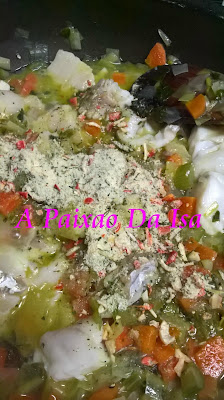 Leve ao lume o azeite e aqueça um pouco e adicione os legumes cortados e lavados e deixe cozer um pouco.Corte o peixe em bocados e depois adicione aos legumes e cozinhe mais um pouco ,junte o cubo de peixe e um pouquinho de agua e cozinha ate o peixe estar cozido.